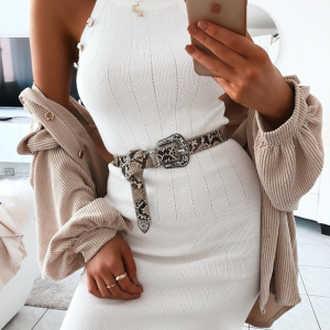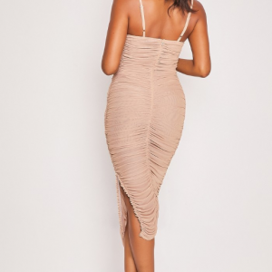 Robe moulante beige, plissée sur toute la longueur, fines bretelles réglables, fendue sur les côtés, composition : 65% Polyester, 30% Coton et 5% Spandex