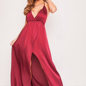 Robe longue satinée bordeaux, croisée et fendue sur le bas, décolleté en V, coques au niveau de la poitrine, sans manches, nœud au niveau de la nuque, dos nu, composition: 100% polyester